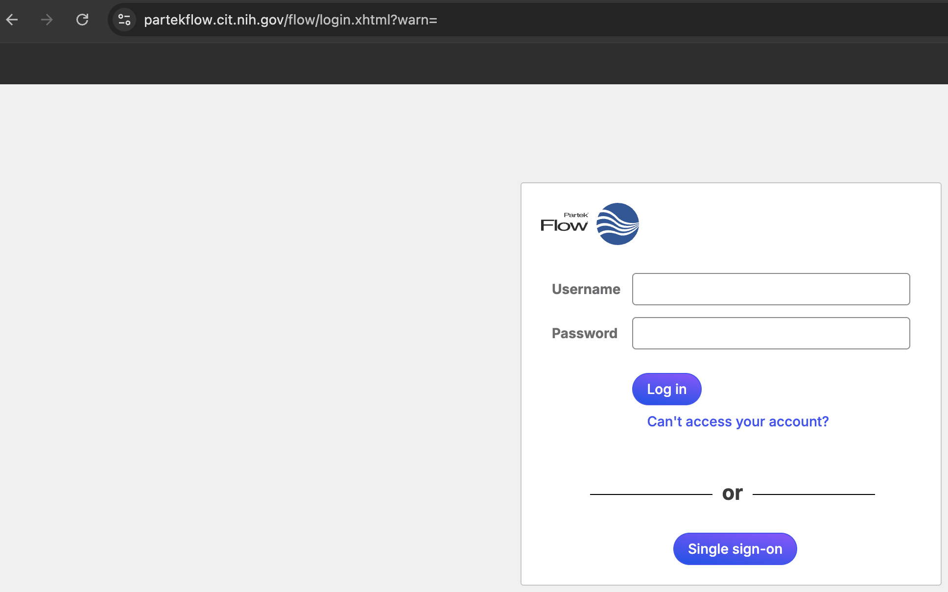Once a Biowulf and Partek Flow account has been obtained, use https://partekflow.cit.nih.gov/flow to connect to the Partek Flow server. Users can either supply username and password to authenticate or use NIH single sign-on.