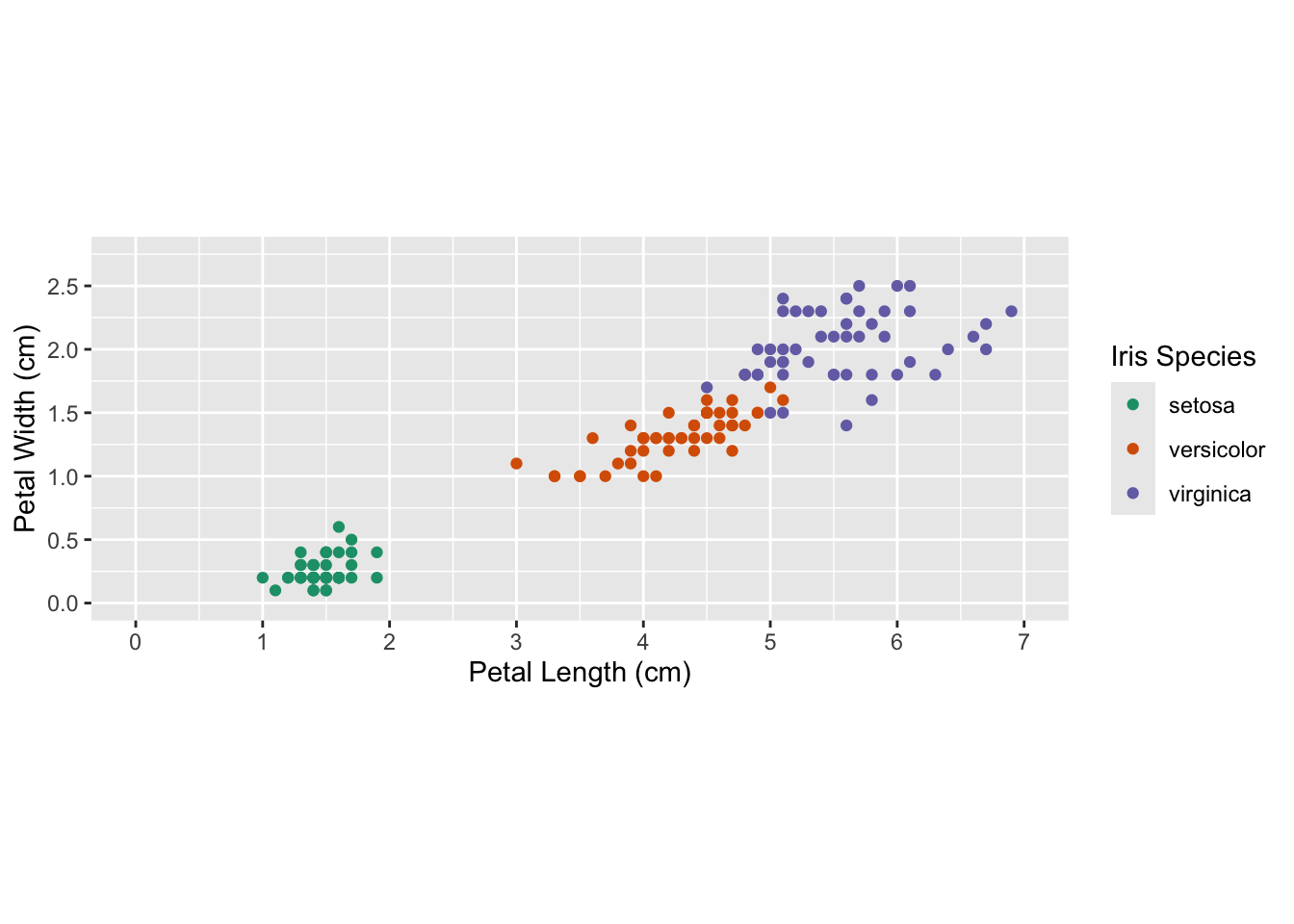 labs(x="Petal Length (cm)", y= "Petal Width (cm)") +