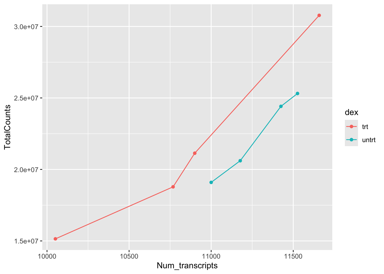 geom_line(aes(x=Num_transcripts, y = TotalCounts,color=dex))