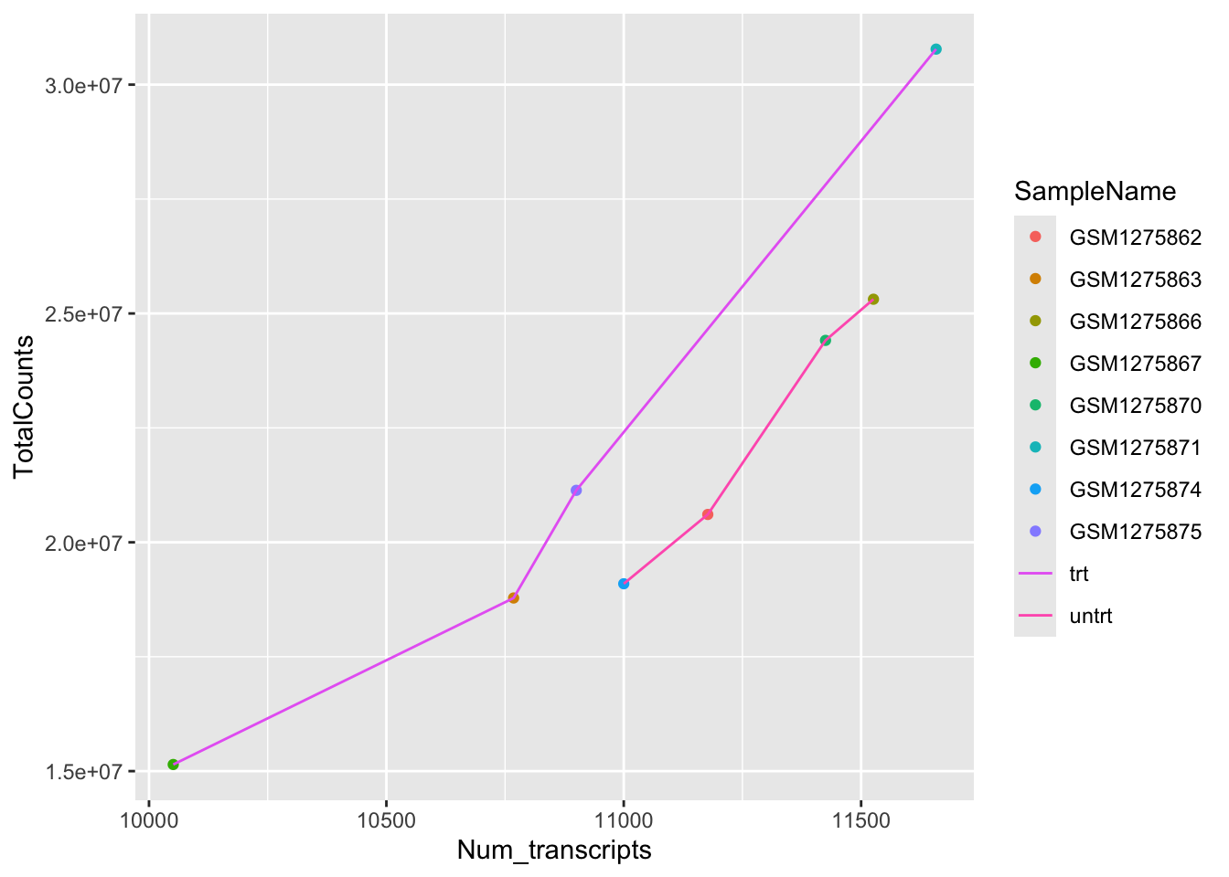 We can easily see that there is a relationship between the number of reads per sample and the total transcripts recovered per sample. ggplot2 default parameters are great for exploratory data analysis. But, with only a few tweaks, we can make some beautiful, publishable figures.