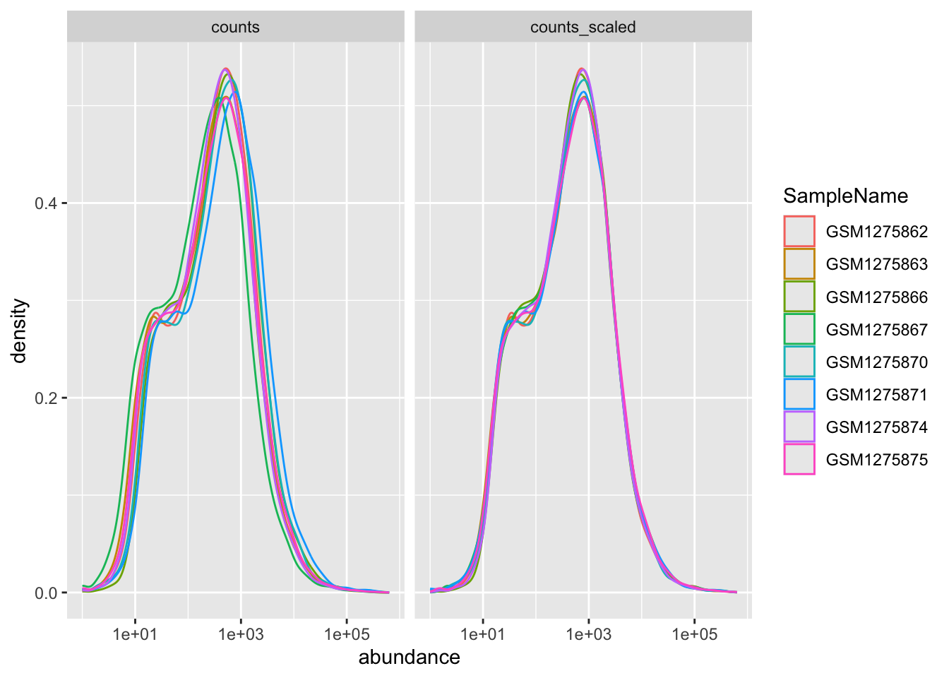 In our example data, density_data, the gene counts were scaled to account for technical and composition differences using the trimmed mean of M values (TMM) from EdgeR (Robinson and Oshlack 2010), but non-normalized values remained for comparison. Thus, we can compare scaled vs unscaled counts by sample using faceting.