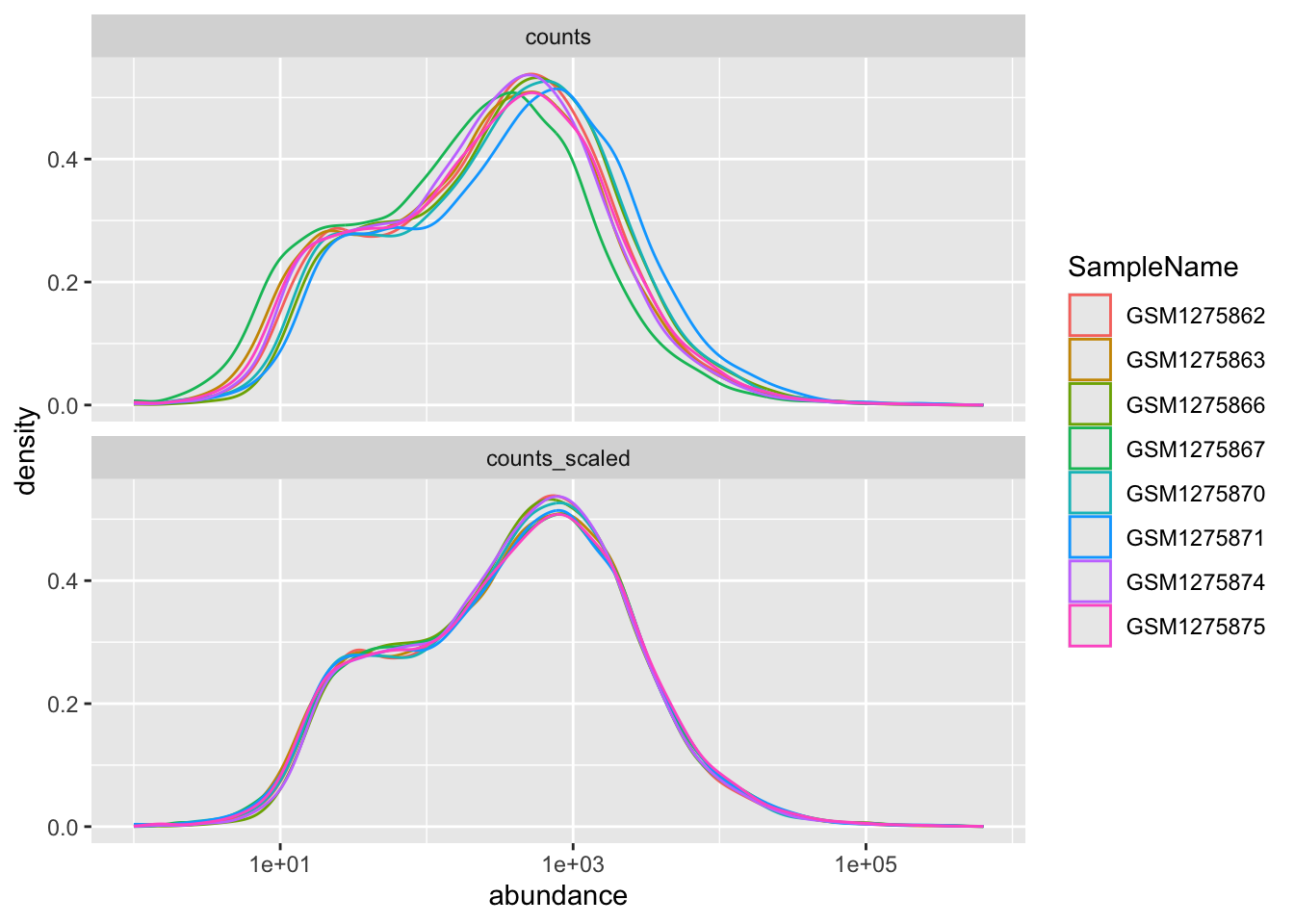 Notice the source column, which indicates whether the counts are scaled or unscaled. These data are in long vs wide format. You may need to reshape the data to represent the information in a specific way with ggplot2. Here, we can use this variable to facet our density plot.