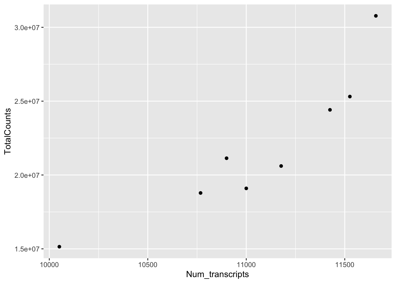 We will examine the relationship between the total transcript sums per sample (total reads) and the number of recovered transcripts per sample.