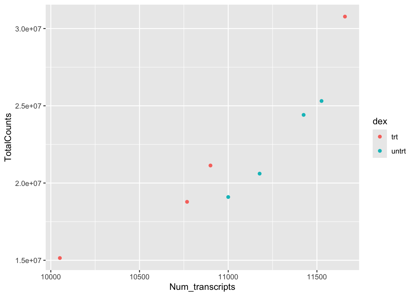 We can easily see that there is a relationship between the number of reads per sample and the total transcripts recovered per sample. ggplot2 default parameters are great for exploratory data analysis. But, with only a few tweaks, we can make some beautiful, publishable figures.